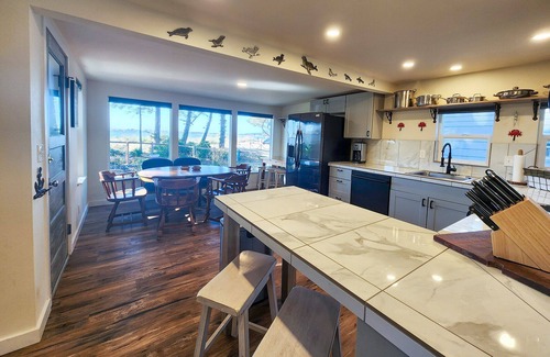 This open concept home on the bay boasts 4 bedrooms and can sleep up to 9 guests. Family and friends will enjoy the outdoor space as well as what this home has to offer inside. The living area is a great place to hang out, cook up a memorable meal in the large kitchen, or play a board game at the dining table. Relax outside on the deck and watch the wildlife while sipping a favorite beverage. Stormy nights are welcome here where you can cozy up to a toasty fire and watch your favorite movie. Three bedrooms upstairs with a shared bathroom, all with bay views, will lull you to sleep with the sound of the sea and the salty breeze. Each bedroom has a queen bed, one with a connecting room that includes a twin bed. Downstairs is another bedroom tucked away for additional privacy. It boasts a comfy king bed that can be made into two twin beds. A bath across the hall along with a kitchenette give this space a feeling of its own apartment.The hot tub will become your favorite destination after your daily adventures. Soak in the warm bubbles and be amazed at the starry night.