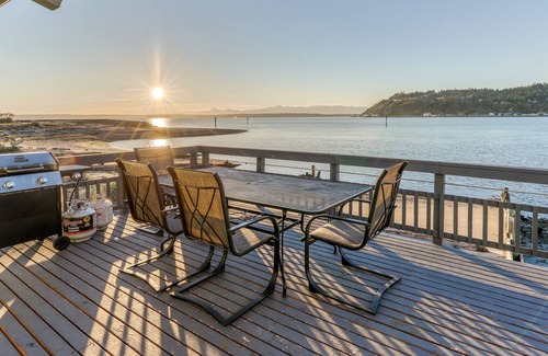 This waterfront home has spectacular views of the bay. During your stay, you will have a full kitchen, a grill, and a patio overlooking the water. In the winter, there is a wood-burning fireplace, board games, and a small collection of books. There is also cable and a DVD player.