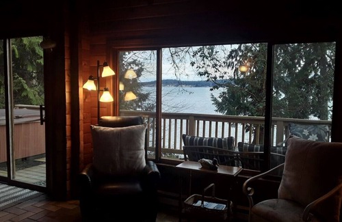 One of our most popular vacation homes. This log home is nestled in a grove of cedars right on the edge of Sequim Bay. Watch the bird activity and sail boats floating by or better yet take the short trail to the waters edge. You can take a beach walk or dig clams (when in season) right by your cabin. This cabin is situated a few steps from the Discovery Trail; you can walk or bring your bikes. The trail goes east as far as 7 Cedars Casino or west beyond Port Angeles. There are two bedrooms, queen and double. The living room, kitchen and dining area are one large great room allowing for easy conversation while meals are being prepared. The deck has a wonderful hot tub for relaxing while breathing in the salty air as the water jets soothe your tired muscles from the day`s hike in nearby Olympic National Park. Fully equipped kitchen, TV, DVD. We have Roku and internet access TV, but not cable channels. Sequim Bay State Park is next door and is available for day use. NOTE: 4WD Vehicles may be required for access to the cabin during winter season. Please inquire before booking, thank you.