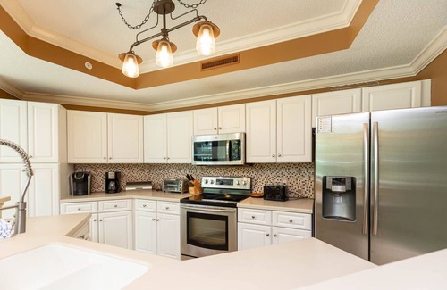 Let the days drift by while enjoying this newly decorated 2-bedroom 2-bathroom condo here at Phoenix on the Bay. This condo is on the 2nd floor with enough room to sleep up to six guests. · Flat screen televisions in the bedrooms and the living area · DVD player and queen sofa sleeper in the living area · Kitchen is fully equipped with all major stainless steel appliances and a tile backsplash · Wet bar has an icemaker · Table in dining area seats four while the kitchen bar has three stools · Full size washer and dryer in the condo · Master bedroom has a king size bed and DVD player · Double sinks on the vanity, jetted Jacuzzi tub, and a walk-in shower with glass door in the master bathroom · Enjoy the stunning bay view from the tiled balcony with a table for four and a chaise lounge