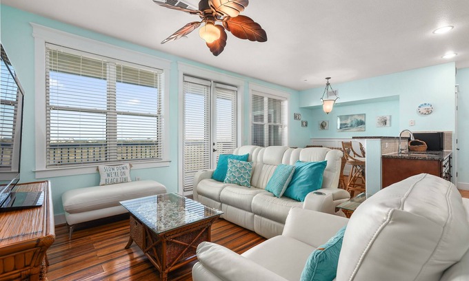 Second floor unit with amazing views of Galveston's West Bay. Sunsets are spectacular from the large comfortable balcony. Fishing, paddle boarding, kayaking are steps away from this unit. A short drive across the street are the inviting large beaches of the Pointe West Community.