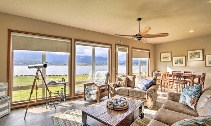 Take the scenic drive off the highway, through the valley of the Olympic Mountains, and find yourself at this Quilcene home’s doorstep! Spend your thoughtful retreat hiking through the Pacific Northwest on the Notch Pass trail 8 miles away, or spot wildlife along the bay from the comfort of this 2-bedroom, 2-bathroom vacation rental. Spend the evening reconnecting with loved ones over a glass of wine while enjoying the dramatic mountain scenery through wall-to-wall windows in the living area!