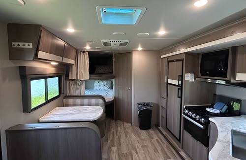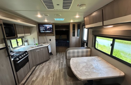 This RV sleeps up to 6 guests and features a private queen master bedroom for quiet rest, along with two queen bunk beds that are perfect for kids or additional guests. A Smart TV in the living area offers a great spot to relax and wind down after a day full of sunshine and salt air.
