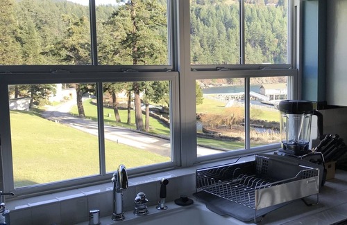 This well-built bungalow-style cottage overlooks Cascade Bay, offer a light, bright retreat from which to view the marina and gaze down the sound. The living quarters are on the upper level, featuring high-end wood floors throughout, a well-stocked full kitchen, spacious living area, and master bedroom with king-size bed. Your hosts have attempted to stock the kitchen with whatever you need to eat-in if desired, and take advantage of the incredible covered deck overlooking the bay. Or take advantage of the plumbed-in Weber grill on the deck.