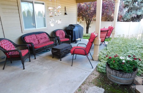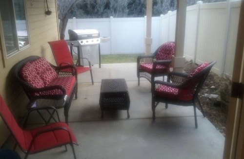 We have a beautiful 3 bedroom single story home for rent which is located in the Treasure Valley area, close to the I-84 corridor. It is within 30 min. of almost everything in the Boise Area. Hardwood floors in entry, dining room and full kitchen which has granite counter tops, stainless steel appliances and full size refrigerator as well. Comfortable living room with 55" flat-screen, satellite TV, DVD, internet, and WiFi. There are two master suites (each with their own full bathrooms) and a 3rd bedroom (w/separate full bathroom sharing with the common areas) featuring Queen Size Beds to sleep 6 comfortably, soaker tubs, designer tile and walk-in shower. Large two car attached garage and a fenced in yard with patio furniture. Settlers Bridge (HOA) boasts a community pool (open from Memorial Day to past Labor Day), tree lined streets, walkways, and playgrounds including a Tot-Lot about 100 yds from the property. We provide pool towels for your convenience. The neighborhood is close to Eagle Road with retail shopping including grocery store.