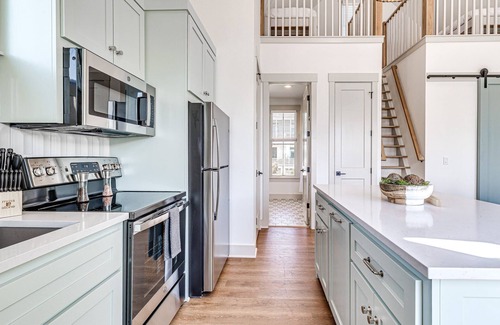 The bright blue exterior pops against the sky and waterline, while the interior colors are soft, and reflect the natural beauty you’ll experience in Carlton Landing. The name, “Be Still”, is inspired by Psalm 46:10. All the details were chosen to create a refuge that comforts and refreshes. The living room boasts impressively tall ceilings that show off the largeness of the space. The entire lake-facing wall is covered in windows, letting in gorgeous light and scenery to the living room, kitchen and sleeping loft. Custom window coverings allow darkness when desired. There’s a full gourmet kitchen with quartz countertops, stainless steel appliances, and plentiful dishes and cookware for up to 8 people.