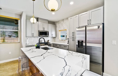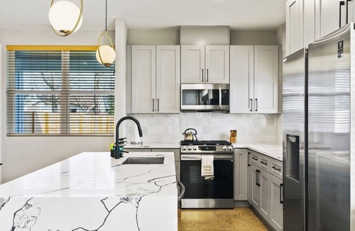 Private home all to yourself. Spacious open layoutβbedrooms upstairs, so much light and space for entertaining. Kitchen is equipped to cook meals in when not out exploring. Fully fenced in private backyard, space for games such as corn hole (stored in the laundry room). Smart tvs in both the living room and primary bedroom. This street is a mix of brand new homes and older homes in an up and coming neighborhood - such a hidden gem pocket close to so much! One king bed, 2 queen beds, and the couch is a sleeper sofa if needed.