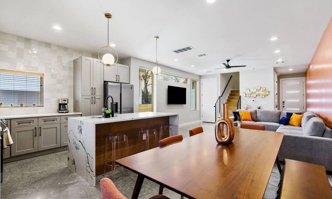 Welcome to your home away from home! βBe there in 10β is just that - nestled between the Domain and Airport, 10 minutes to Downtown and many other hot spots. Accommodations include a spacious open concept main floor with a fully-equipped kitchen, dining room table, half bath, living room with large sectional, & flat screen TV. 3 well-decorated bedrooms located on the 2nd floor w/ trendy furniture, fresh linens, and 2 full bathrooms with everything youβll need during your stay + private backyard.