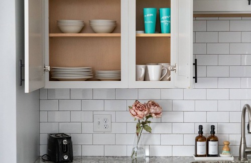 • Kitchen stocked with cookware, glassware, 6 place settings + all essentials to prepare a meal (coffee, creamer, sugar, spices,)