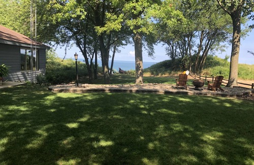 Beautifully modern lakefront property with wonderful amenities. Private stairs to private beach frontage. Lake views. Upper level has two bedrooms and lower level has three bedrooms. Large great room on upper level with two fireplaces and cable TV. One den with cable television on lower level. Large kitchen with new appliances. Dining room that overlooks Lake Michigan. 4.5 bathrooms. Sleeps 10. Large backyard with BBQ grill. Miles away from St. Joseph. Great restaurants nearby. Perfect home for two families to share.