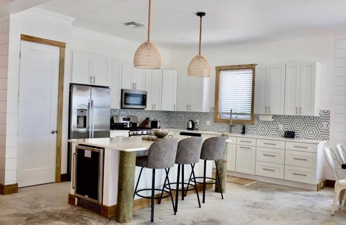 New build, open floor plan, 3 bedrooms, 3.5 baths with 2200 sqft and 700 sqft open-air porch with plenty of outdoor seating to relax and enjoy a morning cup or an evening cocktail.. This home overlooks the white sugar sand beach and crystal clear waters of the Sea of Abaco, perfect for relaxing outside and taking a nap in a super comfy couch, dining outside, or retreating indoors.