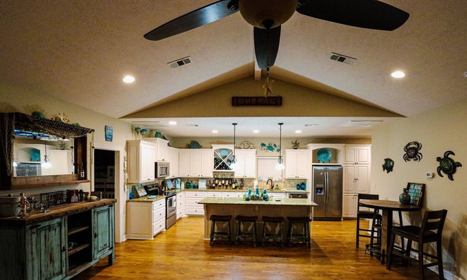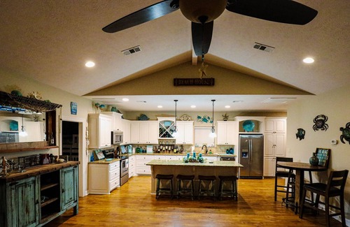 Spacious Beach Cabin, Large deck with water view, very spacious Kitchen w/2 refrigerators and large Living room, 3 bedrooms & 3 baths, sleeps 14 comfortably, Spacious down stairs with 1 wood fire pit & 1 Gas fire pit. large wood smoker w/ fire box, 1 gas grill, wrap around bar w/stools. 4 water mist fans to keep cool, lighted area for night time fun with built in horse shoe pits & Washers . palapa's located on each end w/stools for viewing game while enjoying a beverage. down stairs TV, restroom, counter with sink for food preparations. 2 hot water heaters , laundry room & community sewer for max capacity.
