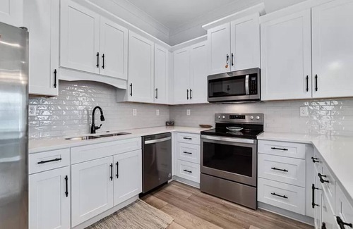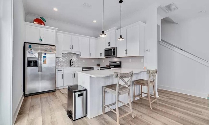 This coastal cottage offers an inviting space to unwind. The modern kitchen, equipped with stainless steel appliances, a stylish tile backsplash, and elegant Quartz countertops, is perfect for whipping up family meals together. Enjoy breakfast at the bar or gather in the cozy living area where you can sink into the comfy sofa and catch up with loved ones. A convenient half bath on the first floor adds to your comfort.