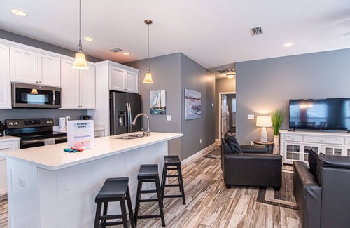 The kitchen is stocked and outfitted with stylish black stainless steel appliances. A large quartz breakfast bar makes meals and cleanup a breeze! The master king bedroom hosts a large closet and full ensuite bathroom with shower. The guest master also has a large closet and shares the hallway bathroom with the bunk room. The bunk room tv table doubles as a laptop friendly work space for catching up on things that simply don't understand vacation. The bedrooms and the living room are all outfitted with new LED tv's which offer either cable or Netflix..