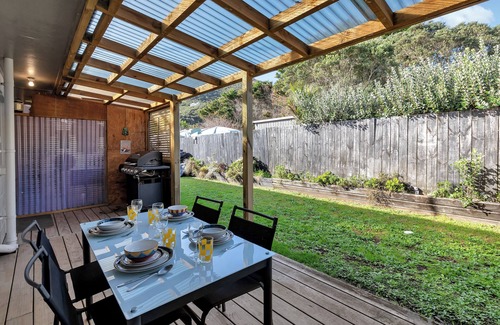 The well-equipped kitchenette provides an air fryer and inverter hob for you to whip up delicious meals. Come together and enjoy breakfast, lunch and dinner in the sheltered outdoor living and dining area complete with a BBQ. With excellent indoor-outdoor flow and a spacious flat lawn, Beach Daze provides a fabulous base for your stay.