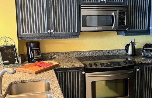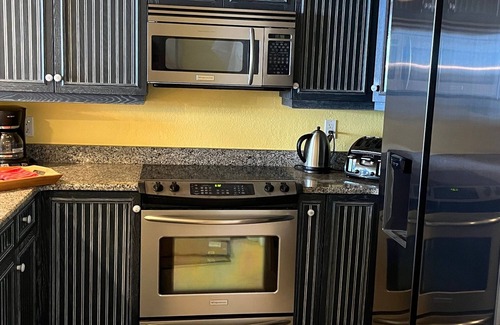 The renovated, fully equipped kitchen (large double door refridgerator, cooktop, oven, microwave, dishwasher, and washer & dryer) is well stocked with plateware, glassware, pots, pans... makes cooking in easy and enjoyable. Granite counter tops and custom made cabinets.