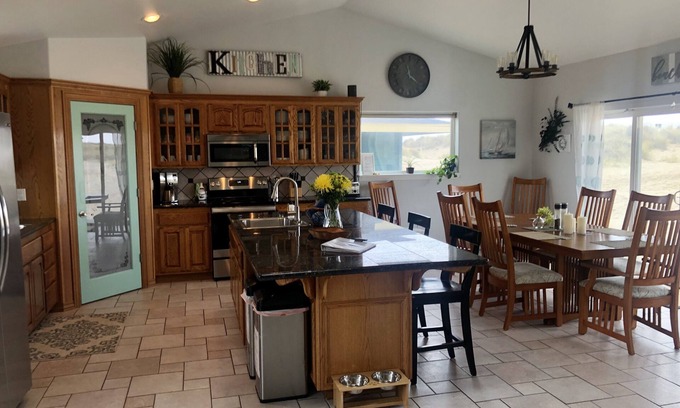 Spacious kitchen with all the amenities, large center Island, Dining room with a view and table and chairs for 8. The Living Room has 2 large picture windows with 2 swivel recliners, and 2 full couches for gazing at the beach/waves, snuggling up with a good book by the fire or just chatting with family.