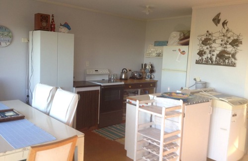 Bungalow close to beach with queen bed and single bed, sleep-out that sleeps 4, queen bed & bunks. Separate bathroom. Deck and great ocean views.