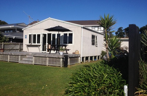 This classic kiwi bach was built in 1995. It s open plan inside. There is a lovely deck out the front from which you can take in the beautiful views of Whiritoa beach and Mayor Island. There is a temporary fence that can be put across the front to keep pets/children securely in section.