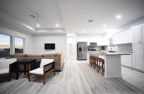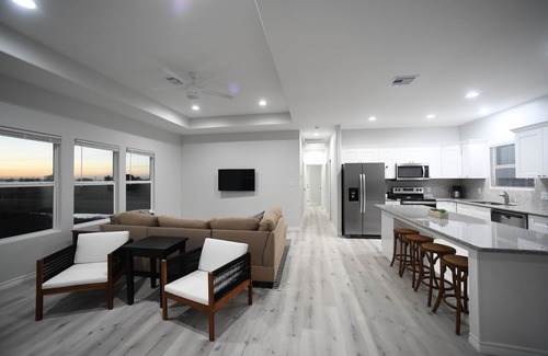 3 BR/ 2 Bth sleeps MAX 8. The on-suite master bedroom features a king bed, double vanity and shower. The second bedroom features a queen bed. The third bedroom features a double bunk with 4 twin beds which top bunks are only suitable for kids. The second bathroom also includes the stackable washer and dryer.