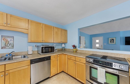 We have a large fully stocked kitchen with a pass thru to the living area.