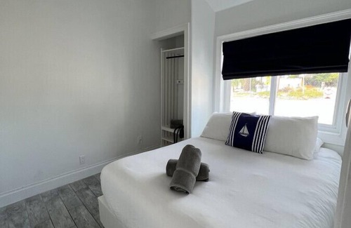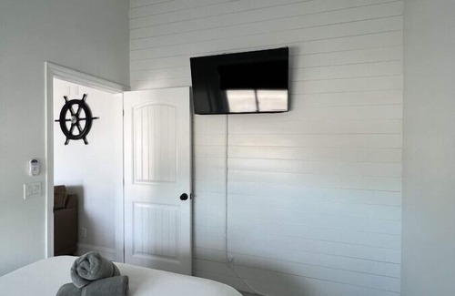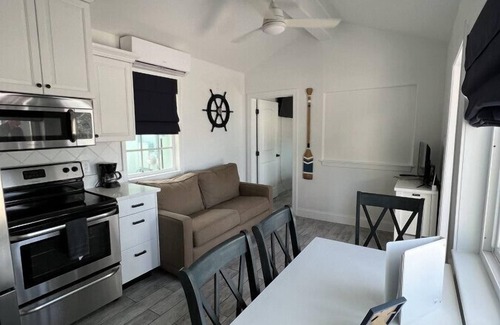 Our nautical-inspired cottage accommodates up to 4 guests with 1 comfortable queen-size beds and a 1 full-size pullout sofa-bed, along with a beautifully tiled bathroom with a walk-in shower, complete with towels and all the toiletries you need throughout your stay. The unit includes a dining area and an equipped full-size kitchen with quartz countertops, stove, oven, refrigerator, microwave, and all the necessary cooking and dining utensils, so it's perfect for enjoying home-cooked meals.