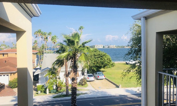 Beach condo one block away from the gulf of Mexico. Condo on top floor of building with intercoastal water views from front seating area. Large back outdoor covered balcony. 2 large bedrooms with 2 queen size beds, 2 full bathrooms, open kitchen, dining room and living room floor plan. Well-lit with large windows and sliding glass doors from living room and from Master bedroom leads to sunny balcony with views of palm trees and tropical foliage. Friendly quiet PassAGrille neighborhood offers plenty of activities, walking distance from local art galleries, beach side restaurants, boating, midnight cruises, swimming, and gorgeous soft sandy beaches with warm coastal waters will delight you and entice you! Beach cruiser bikes for two also available to our guests