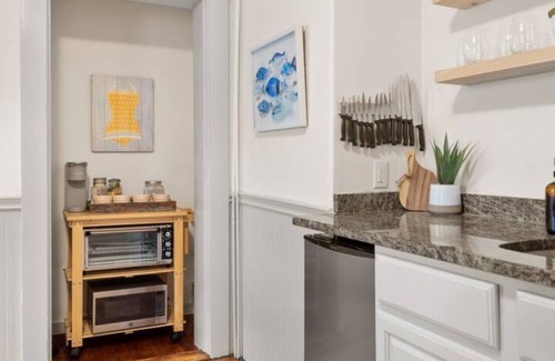 Pull into our quiet village neighborhood and you'll find our historic colonial home. Head into your private side entrance and check out the kitchenette equipped with all the conveniences you'll need during your stay - microwave, mini fridge, and coffee bar.