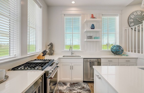 Inside, the beachy vibes continue with fun pops of blue and coastal decor while natural light streams through expansive windows. Kick back in the living area on the fun sectional and stream your favorite shows or movies on the TV. When everyone builds up an appetite, the full kitchen will beckon the group's chef to whip up tasty meals and snacks using stainless steel appliances, including a dishwasher, and modern cookware. The picnic table will make for terrific outdoor dining. Plus, everyone can be a part of the conversation with island seating and an open layout seamlessly flowing from room to room. After a day at the beach, come back to spritz away the sand with the water hose next to the outdoor grill.