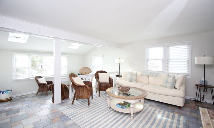 Open-Concept Living Area – Relax in the stylish seating area with a flat-screen TV (Roku included) after a long day at the beach.