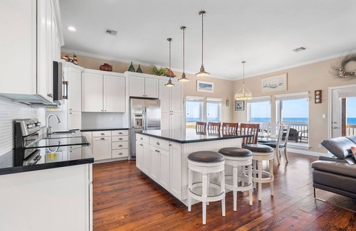 Inside, the open-concept main level features a fully equipped kitchen, cozy living area, and dining table with bench seating—all framed by stunning beach views. A powder room adds convenience, and a main-level king suite with deck access offers a peaceful retreat. An elevator makes moving between floors a breeze. Upstairs, the spacious primary suite includes a king bed, private bath, and a balcony with seating and ocean views. Two additional bedrooms—one with two queen beds and another with two pyramid bunks plus trundles—offer flexible sleeping arrangements for families or groups.