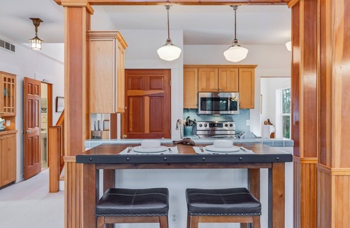 Every detail of Sea Spirit has been thoughtfully curated for comfort, from the plush mattresses and linens to the cozy furnishings. Rich wood accents create a warm, inviting atmosphere, while the open floor plan ensures easy flow for gatherings and celebrations. Sea Spirit has two living spaces. One on the main level with fireplace and surrounded by windows that face the tall trees. The other is downstairs and made for fun with an 85" TV, game/puzzle table with chairs, a wet bar and more.