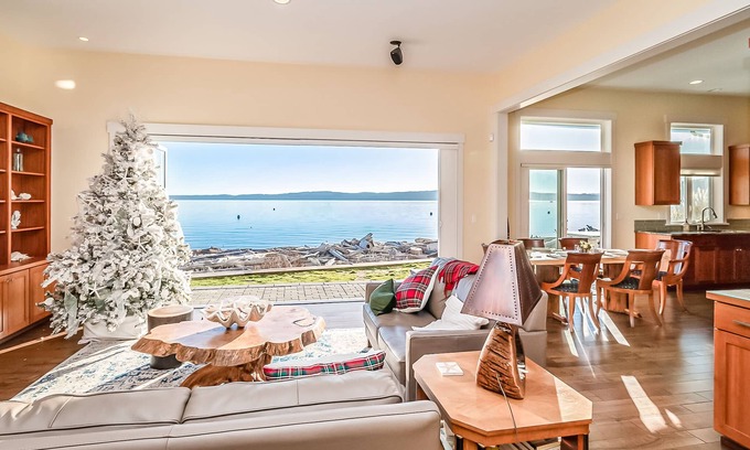 On tranquil beaches of Camano Island, you'll find stunning views within this ocean-facing 4-bedroom getaway. Imagine waking up to the gentle lapping of waves and the stunning water views from your private balcony. Spend your days watching the whales, enjoying the free WiFi, and gathering around the fireplace for cozy movie nights on the smart TV with satellite/cable channels.