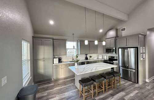 As you enter this home via exterior stairs, you'll be greeted by a host of thoughtful touches - central air conditioning and accent walls. The living room boasts plentiful seating, and a 65-inch Smart TV. It also seamlessly blends with the kitchen, outfitted with stainless steel appliances, countertop, a modern sink, and subway tile backsplash. There's a separate pantry for your dry goods and ample space to dine at the four-person island and the adjacent dining room table for six.