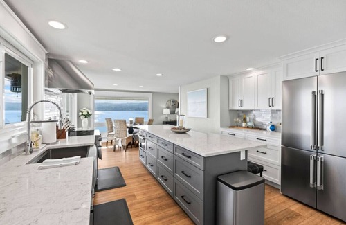 To the left of the living room, you will find the impeccably remodeled large kitchen equipped with all the essential cooking gadgets to ignite your culinary creativity. Whether you're whipping up a leisurely breakfast while admiring the stunning waterfront views or delving into the creation of a culinary masterpiece, this kitchen serves as a haven for culinary enthusiasts. With its spacious island, ample cabinetry, and two sinks, every culinary task is made effortless and enjoyable. And when it's time to savor your culinary delights, indulge in a meal at the waterfront table, completing the culinary experience with unparalleled ambiance.