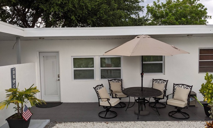 It only takes one minute to drive or 8 minutes to walk over to the beautiful Nokomis beach on Casey Key. Supermarkets, gas stations, banks, restaurants, bike/boat/kayak and jet ski rentals are close by. There are only three condos on the property. Calm neighborhood with lots of palm trees and other tropical plants. Enjoy your mornings sipping coffee on the patio. Walking through the bridge to the island, you can watch boaters sometimes followed by dolphins on the intercoastal waterway. We provide beach accessories. Free on site parking. We look forward to having you!