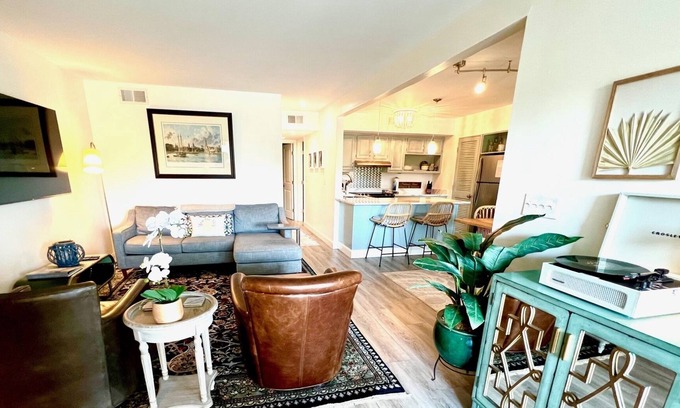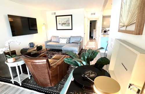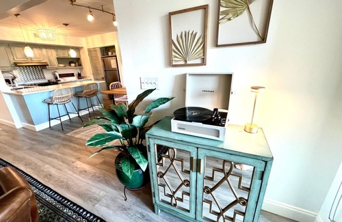 A comfortable entertaining area offers visitors an ideal place to unwind after a day of sightseeing or lounging by the pool. Off the kitchen area, this space features a new area rug, comfortable sofa and arm chairs, large screen smart TV, vintage record player, separate desk space, and ample lighting. The living areas are perfect to unwind after a long beach or pool day.