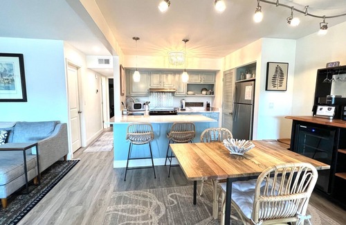 Inside the villa, a bright, airy, open floor plan features a dining area, stocked coffee bar with wine refrigerator, kitchen and living room area. The coastal kitchen features new quartz countertops, modern appliances, garbage disposal, ample serveware and cookware, and counter stool seating.