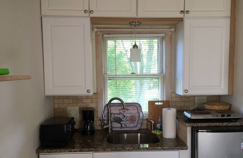 Kitchen is equipped with dishes, pots and pans. There is a small fridge, electric cooktop with 2 burners, toaster oven and small coffee maker. Full size sink and granite counter space.