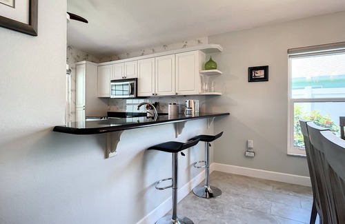 As you enter this spacious home you are greeted by vaulted ceilings, high-end furnishings, and tasteful Florida décor including many pieces of local art. This includes a fully equipped kitchen stocked with all your cooking essentials and features appliances such as a Keurig, drip coffee maker, kettle, crock pot, and more! The eat-in kitchen offers seating for two and is perfect for those looking for a quick bite before they head to the beach! Friends and family will enjoy time together at the dining room table that seats up to eight guests in a wide-open floorplan. This solid concrete-walled, storm-resistant home is perfect for those who enjoy a luxurious private space in a quiet location where you can rejuvenate and plan your next adventure, right next to all the action!