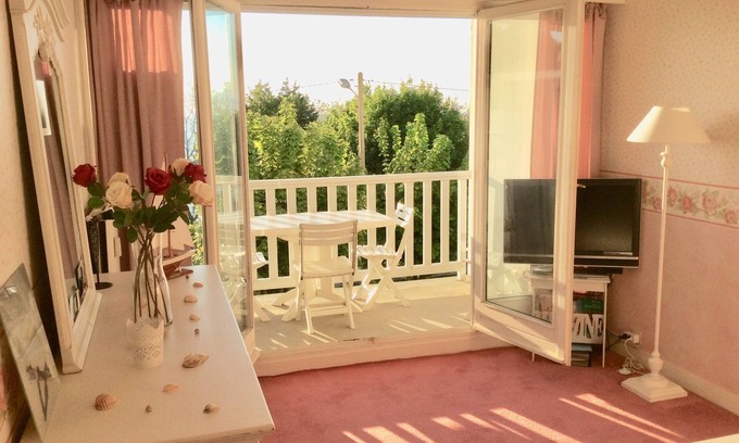 Ideally located on the flowered coast between Honfleur and Deauvillle, charming romantic apartment with sea view and balcony equipped for meals, including parking and linen (sheets, beds made, towels, towels).