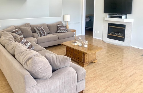 Stay calm and Beach On! A spacious and cozy Semi-waterfront Duplex, with 3 bedrooms and 2 bathrooms, is the perfect fit for a family. This sought after lake living comes at the lower price point of being semi-waterfront, but has all the amenities of a waterfront property.... Complete with your own private/shared beach, dock and a buoy! (see details below) Crowfoot Mountain Sledding Staging area is only an 8-10 minute drive from this property and also provides what every Sledder desires in a rental - pull-through driveway access! Ample room to park your trailer, just pull in - park - and go! There is also a parking spot to allow for 1 RV to stay (at an extra nightly cost) with water and power hook-ups.