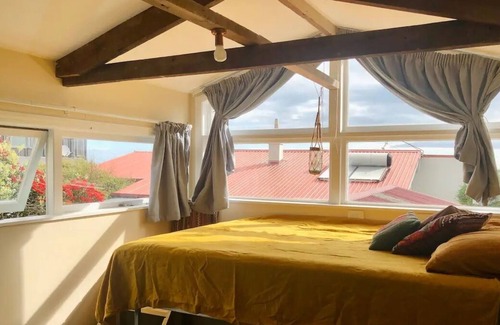 This is a cute little hideaway for two over looking Castlecliff beach. It is self contained and private with it's own bathroom and small kitchen. There is no oven but there is a bench top cooker. In the bathroom there is a concrete kiln room where a previous owner used to fire their pots, this area now houses a concrete bath. There is a small private courtyard area to enjoy your morning coffee or your evening wine or beer. Beach access is just two doors down.
