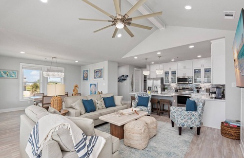 Every room is tastefully appointed with contemporary finishes, accentuated by hints and accents of sand and sea, creating an ambiance of coastal bliss and relaxation throughout the beach house. The Primary Bedroom awaits you with a lavish King bed, complete with a TV for your entertainment during your nightcap. The primary bedroom boasts an ensuite bathroom, complete with double sinks and a stunning shower that will make you feel as if you're bathing beneath a gentle waterfall. For families with little ones, a crib is thoughtfully provided to ensure a cozy stay for everyone. The Second Bedroom is a tranquil oasis, offering another King bed and a TV, ensuring a peaceful and restful night's sleep. Meanwhile, the Third Bedroom beckons with a plush Queen bed and a TV, providing a serene space to unwind and recharge. Younger guests will find delight in the Fourth Bedroom, designed with them in mind, featuring 2 bunk beds and their very own TV for endless fun and entertainment. The common area is versatile, offering a pull-out couch for additional sleeping options and the flexibility to use an air mattress if needed, accommodating even more guests comfortably.