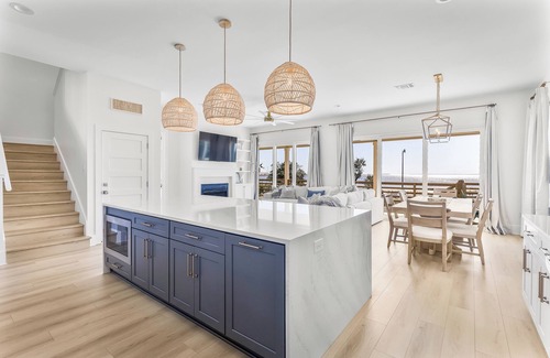 The luxurious primary suite provides the ultimate in relaxation with a King Bed, access to the balcony overlooking the pool and ocean, a cozy fireplace, an en-suite spa-like bathroom, and a walk-in closet. Four additional beautifully appointed bedrooms offer lots of space and serene décor for family or guests. 2 of the additional bedrooms have king beds and water views. The middle upstairs bedroom has a queen bed, also with water views, and the bunk room has 2 full size beds on bottom with 2 twins on top making it possible to host 14 guests comfortably.