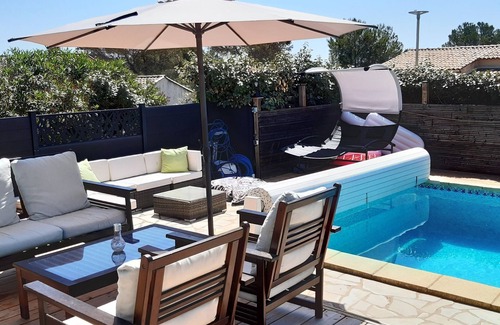 Beach villa between sea and hill, private pool, air conditioning, 4 bedrooms, quiet area is located in La Bouverie. Beach villa between sea and hill, private pool, air conditioning, 4 bedrooms, quiet area provides accommodation, featuring Bedding/Linens, Pet Friendly, Pool, among other amenities. This Villa features Bedding/Linens, Pet Friendly, Pool, to make your stay a comfortable one.
