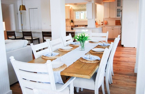 The large gourmet kitchen has everything you’ll need for doing your own cooking or having a chef do it for you! The comfortably-furnished family room is light and bright for enjoying time out of the sun. There are two King bedrooms with ensuite bathrooms on the main floor, and a new bunk room with 4 Twins and a small bathroom great for kids on the floor below. Upstairs is the master bedroom with a King bed and its own bathroom, as well as two additional bedrooms: one with two Queens, and one with one Queen, a hall bath, and a laundry room.