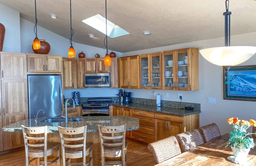 Our home has soaring vaulted ceilings with massive wood beams throughout and a 14-foot tall wall of windows in the great room that brings in the sunshine and make the stunning beachfront views an integral part of the home. The great room is spacious and comfortable with a wood-burning fireplace in the living area, dining area that seats 10, and a gourmet island kitchen with stainless appliances, custom cherry cabinets, granite counters and everything a chef would need. Also in the great room are a built in cherry desk and bookshelves, 50 inch HD smart TV, complimentary high-speed internet, and a comfy window bench nestled below the wall of windows, perfect for reading or relaxing, or my favorite... napping, while you take in the spectacular beachfront views.