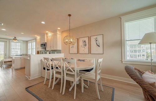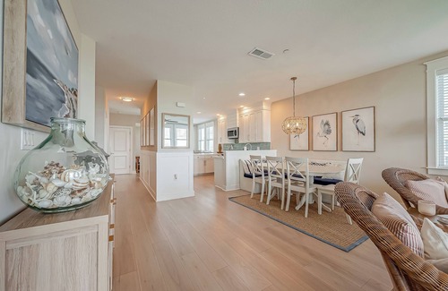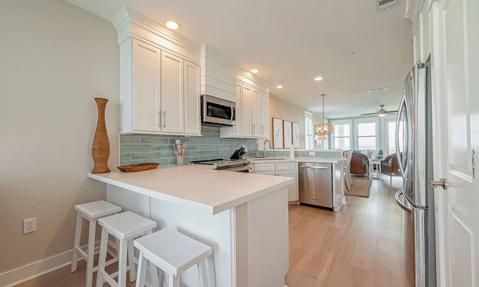 The fully equipped kitchen at Beachfront Bliss features modern quartz countertops and stylish blue glass backsplash. It has all the amenities needed for family meals, from high-quality cookware to children’s dining essentials. Coffee and hot chocolate Keurig pods provided for your enjoyment.