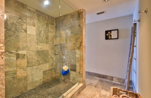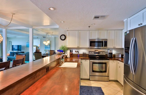 Wake up every morning as you watch the dolphins play in the waves from the oceanfront master bedroom. The master features sliders to the balcony, a smart TV, DVD, and a private master bath with dual sinks and a walk-in shower. This dreamy master bedroom also features a small bar with a wine cooler and coffee maker This wonderfully appointed condo is perfect for multiple families traveling together! The 2nd bedroom features a queen size bed and the 3rd bedroom, has 2 sets of bunks(4 twins). The 2nd full bath, located in the hallway just off the kitchen features dual sinks and a tub/shower.